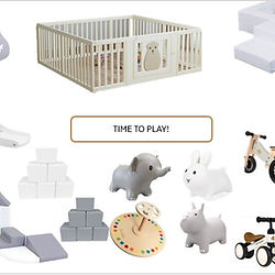 - 10x10 or 12x14 gated area - Beige mats - White ball pit w/ 400 balls - Slide - Gray and white soft play - White stacking soft play cubes - Soft play brick and lumber - 3 bouncy animals - Rocking car - Spinner - 2 bikes - 2 large climbing cubes - Tunnel